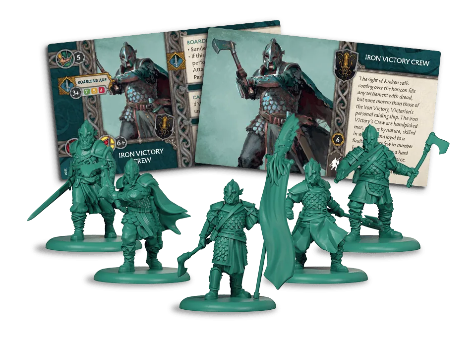 Zestaw Załogi Żelaznego Zwycięstwa do A Song of Ice and Fire: Figurkowej Gry Bitewnej daje dowódcom rodu Greyjoy nową jednostkę skoncentrowaną na walce wręcz. Ta elitarna załoga abordażowa staje się jeszcze bardziej zabójcza w miarę jak zdobywa kolejne łupy z grabieży na jednostkach przeciwnika.