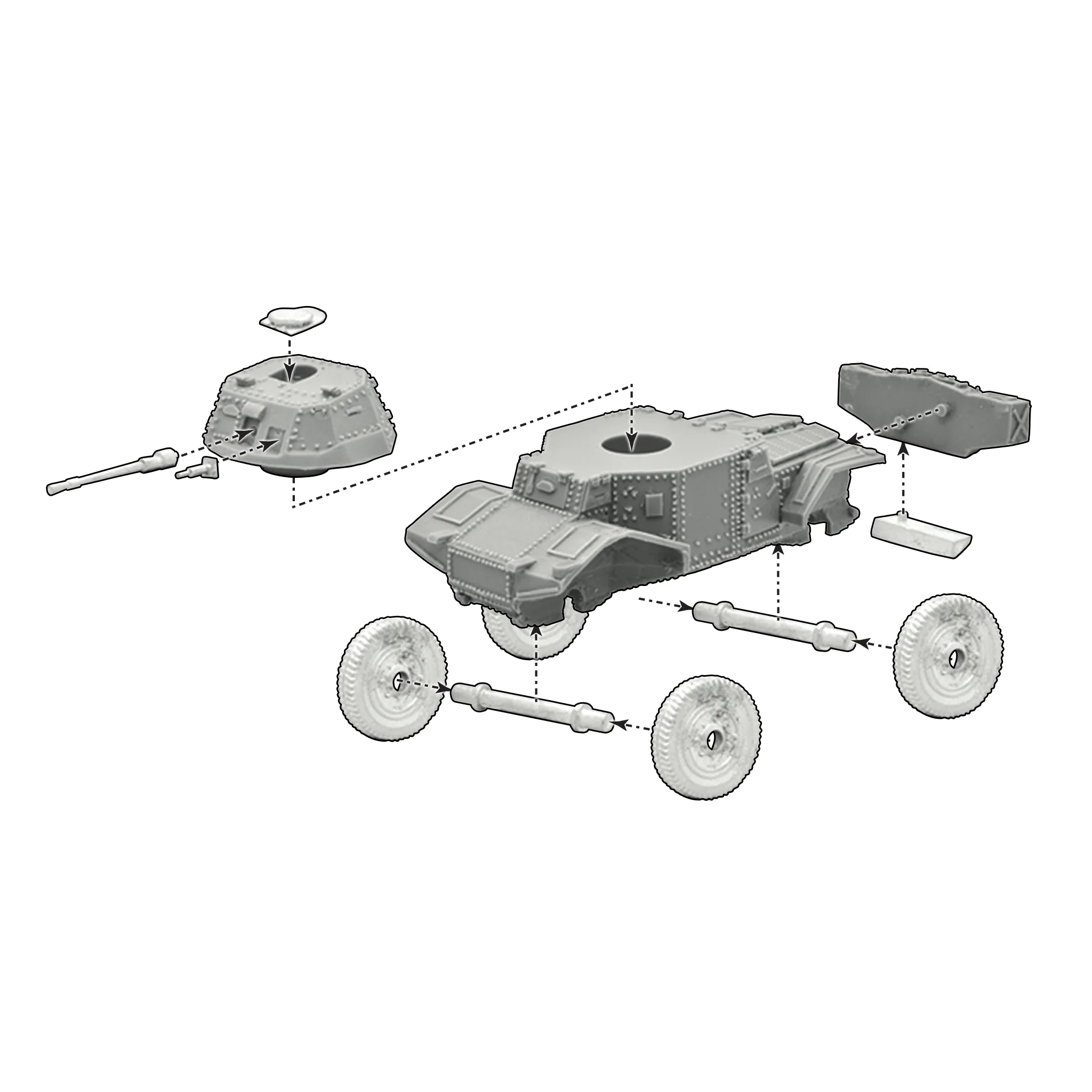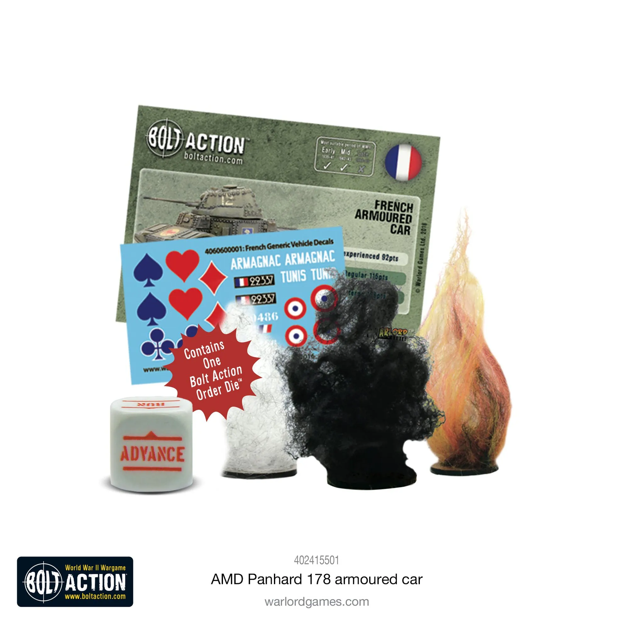 Zestaw zawiera jeden samochód pancerny Panhard 178 wykonany z żywicy i metalu z metalowym członkiem załogi, kartami statystyk, znacznikami uszkodzeń, arkuszem kalkomanii i kostką rozkazów.