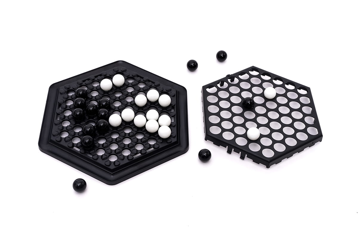 Dwoje przeciwników zasiada naprzeciwko siebie, by wziąć udział w angażującym pojedynku umysłów. Na sześciokątnej planszy znajdują się czarne i białe kule – każdy z graczy posługuje się jednym z kolorów. Aby wygrać, należy wepchnąć 6 kul przeciwnika do rynienki biegnącej wzdłuż krawędzi. Obserwuj, planuj... i rozważaj możliwe posunięcia przy każdym kolejnym ruchu!