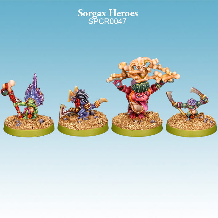 Zestaw zawiera 4 jednoczęściowych figurek żywicznych Sorgax Heroes(2 Czempionów i 2 Magów) i 4 okrągłe, plastikowe podstawy 25mm. Wymagają montażu, czyszczenia i malowania. Figurki są przeznaczone do gry Argatoria do armii Sorgax.