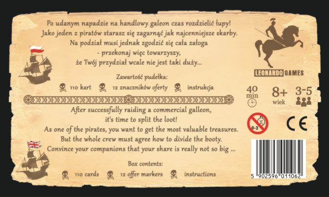 Po udanym napadzie na handlowy galeon czas rozdzielić łupy! Jako jeden z piratów starasz się zagarnąć jak najcenniejsze skarby. Na podział musi jednak zgodzić się cała załoga - przekonaj więc towarzyszy, że Twój przydział wcale nie jest taki duży...
