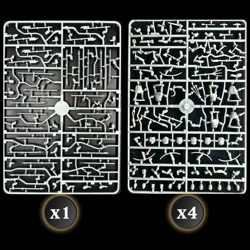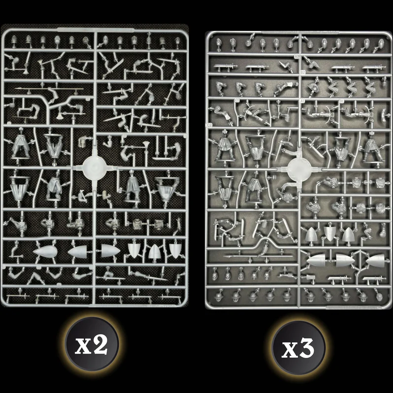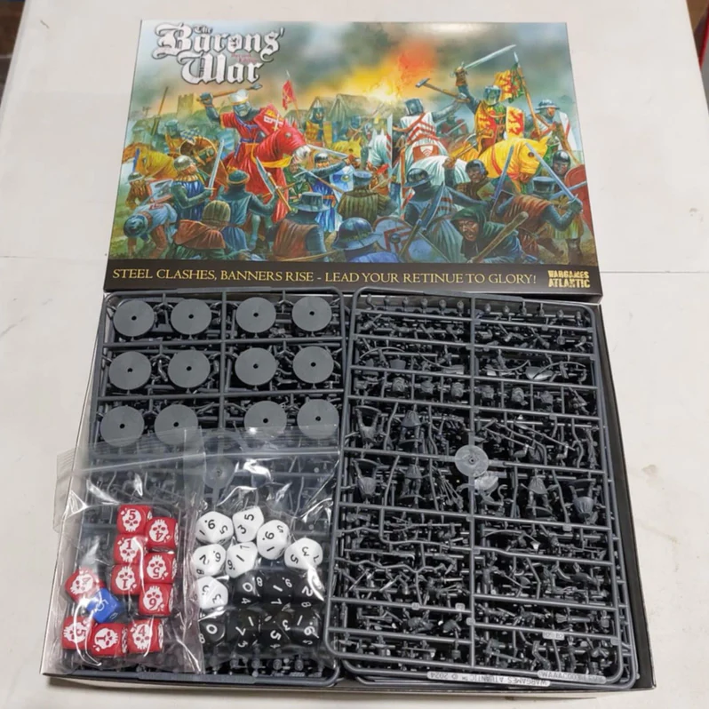 To pudełko zawiera niezbędne elementy do gry w Wojnę Baronów, w tym wystarczającą liczbę figurek 28 mm, aby zbudować dwa początkowe orszaki o wartości 500 punktów lub jeden orszak o wartości 1000 punktów.