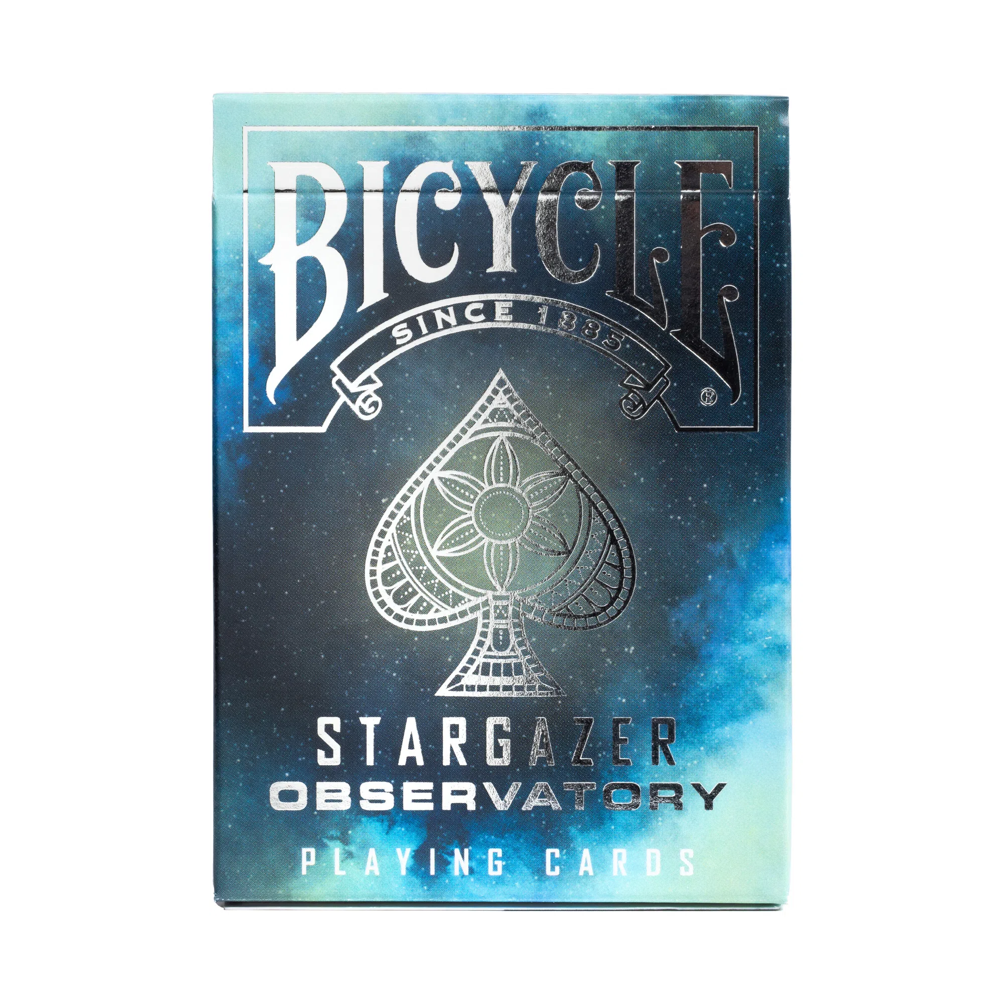 Karty do gry Bicycle Stargazer Observatory to najnowszy dodatek do kolekcji Bicycle Stargazer o tematyce kosmicznej. Projekt kart do gry Bike Stargazer Observatory został zainspirowany konstelacjami i świętą geometrią. Zaszewka i rewers karty mają barwy i kolory z głębi galaktyki. Podobnie jak reszta kolekcji Stargazer, ta talia zawiera wysokiej jakości opakowanie foliowe na zakładce, ukazujące piękne srebrne akcenty foliowe. Seria jest ulubieńcem kolekcjonerów ze względu na piękną sztukę i tajemniczy temat astronomiczny. Karty do gry Bicycle Stargazer Observatory są drukowane na najwyższej jakości brystolu marki Bicycle z wykończeniem Air-Cushion.