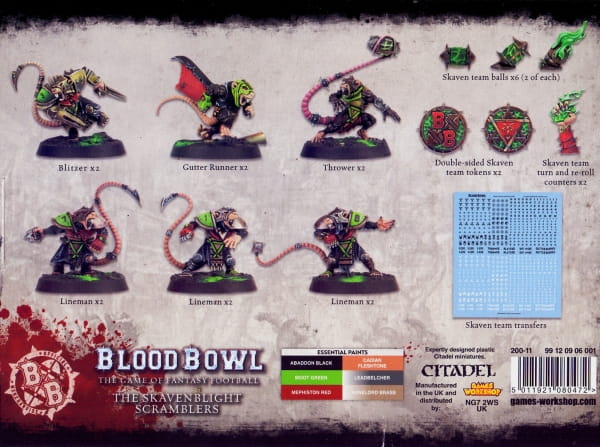 This multi-part plastic kit contains the components necessary to assemble the Skavenblight Scramblers, a team for use in games of Blood Bowl. You’ll receive 2 Blitzers, 2 Throwers, 2 Gutter Runners and 6 Linemen, and a roster sheet. Supplied with a transfer sheet, turn markers, extra balls, and 12 Citadel 32mm Round bases featuring holes to keep the ball in.