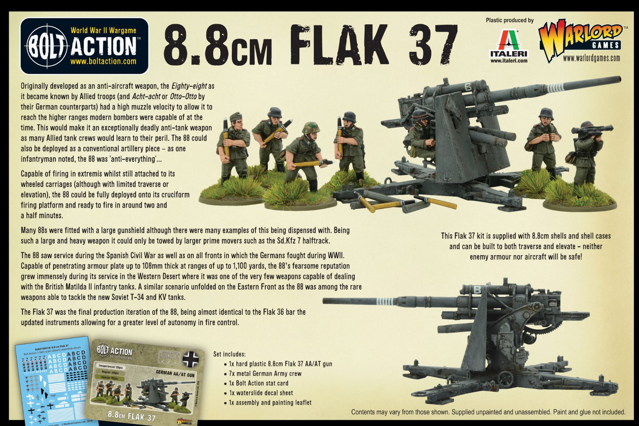 Zawartość pudełka: Jedno twarde plastikowe działo przeciwlotnicze/przeciwpancerne 8,8 cm Flak 37, które może się podnosić i obracać, z 7 osobową metalową załogą armii niemieckiej. W zestawie pełnokolorowa kalkomania wodna i ulotka konstrukcyjna.