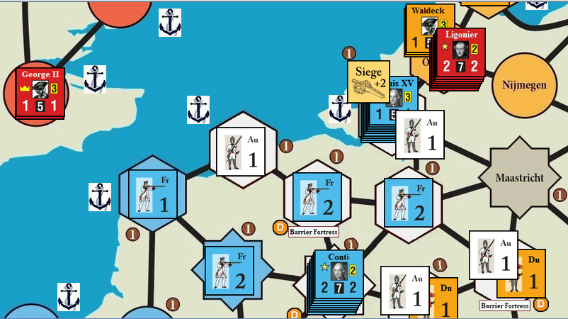 The Br/Pied player has the most subtle, difficult – and most important – role in the game. He has a high-quality British/allied army, but it is small, led by indifferent leaders, and can generally be augmented only by low-quality Dutch troops since Austria will have its hands full fighting elsewhere. Yet this mediocre, polyglot army is often the primary protector of the VP-rich Austrian Netherlands against the mighty French Marshal De Saxe! The British player must also selflessly prop up his allies by playing subsidy (reinforcement) cards, which are essential for Austria’s survival and ability to launch counteroffensives in the mid and late war periods. But the British player has a powerful fleet and, if he (literally) plays his cards right, can use it to cut off France from its overseas resources, starving it of reinforcements in the critical late war years.