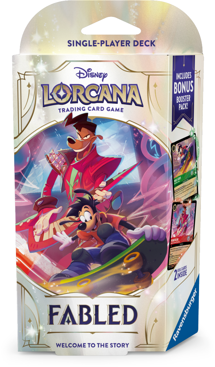 Disney Lorcana: Fabled - Single-Player Deck - Max Goof & Powerline to gotowa talia zbudowana z 60 kart, idealna na początek przygody z grą. Produkt zawiera też 11 znaczników do gry, instrukcję i jeden Booster Pack zawierający 12 losowych kart pozwalających rozbudować talię.