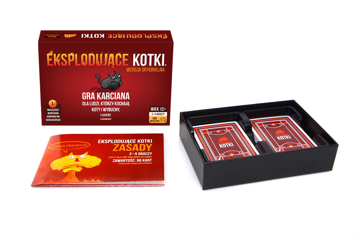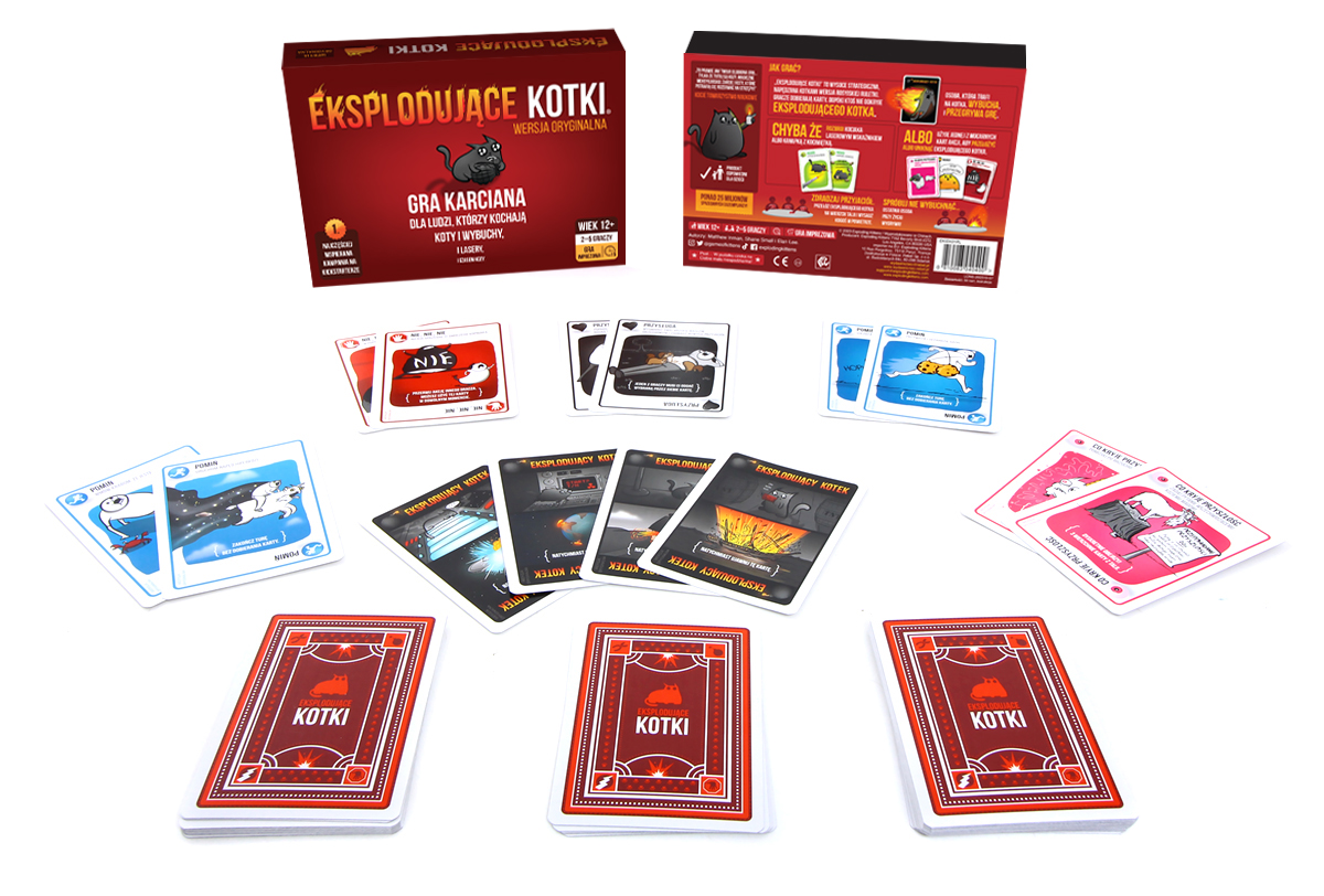 Eksplodujące Kotki to napędzana kociakami odmiana rosyjskiej ruletki. Gracze ciągną co turę po karcie, aż do momentu dobrania eksplodującego kota - wtedy nieszczęśnik wybucha i ginie, a gra się kończy. Ale! W talii są też karty, dzięki którym można odwrócić uwagę samobójczego kocięcia, uniknąć go, czy też zmusić przeciwnika do dobrania kilku kart na raz.