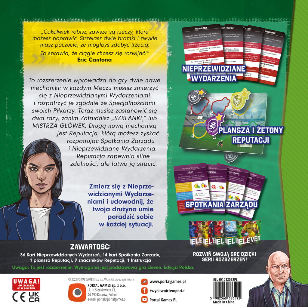 Nieprzewidziane wydarzenia to dodatek do Eleven, strategicznej gry Thomasa Jansena (Club Stories, Tavern, Streetpainball) osadzonej w świecie piłki nożnej. Dobra organizacja i przygotowanie prowadzą do sukcesu, ale nawet one mogą nie wystarczyć. Na nic zda się ciężka praca w obliczu nieprzewidzianych wydarzeń. Czasami zły dzień pojedynczego piłkarza może przesądzić o klęsce… Rozszerzenie wprowadza nowe karty Spotkania Zarządu, lecz przede wszystkim — karty Nieprzewidzianych Wydarzeń i planszę Reputacji. Nowy rodzaj kart uczyni mecze bardziej realistycznymi — bo przecież nic nie może pójść idealnie. Z kolei plansza Reputacji pozwoli wam przejąć kontrolę nad sytuacją albo wręcz odwrotnie — im niższa będzie wasza pozycja na torze, tym więcej przykrych rzeczy może was spotkać. Nieprzewidziane wydarzenia są całkowicie kompatybilne z pozostałymi dodatkami do Eleven.