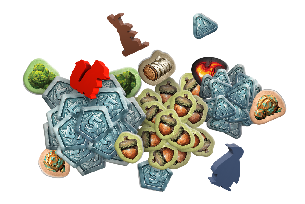 - różne dodatkowe żetony (śnieg, ogień, konary brzozy, kępki mchu, grudki miedzi, żołędzie, punkty, żetony Łapy)