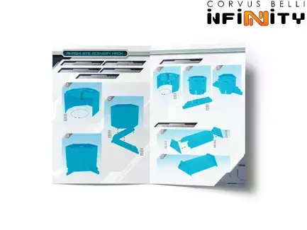 Pakiet Scenerii zawiera gotową do gry, dwustronnie zadrukowaną, tekturową scenerię (5 budynków, 4 generatory i 5 złączy zasilania i danych), matę do gry, a także tekturowe markery, szablony i narzędzie pomiarowe. Wszystko, czego potrzebujesz, aby zacząć grać!