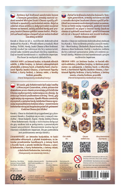 - Karak 2 Chaos to duży dodatek do gry Karak, wprowadzający nowe tryby rozgrywki, takie jak budynki (które mogą być różne dla poszczególnych graczy), nowego bossa, potwory, przedmioty oraz wyzwania dla graczy. Elementy te są modułowe, dlatego gracze sami mogą zdecydować, które z nich wykorzystają w trakcie rozgrywki. Możecie jednak być pewni, że po ich dodani gra zaoferuje intensywniejsze wyzwania oraz rozbudowaną fabułę, a gracze będą mogli cieszyć się nowymi decyzjami strategicznymi i jeszcze bardziej ekscytującą rozgrywką.Pudełko zawiera:
