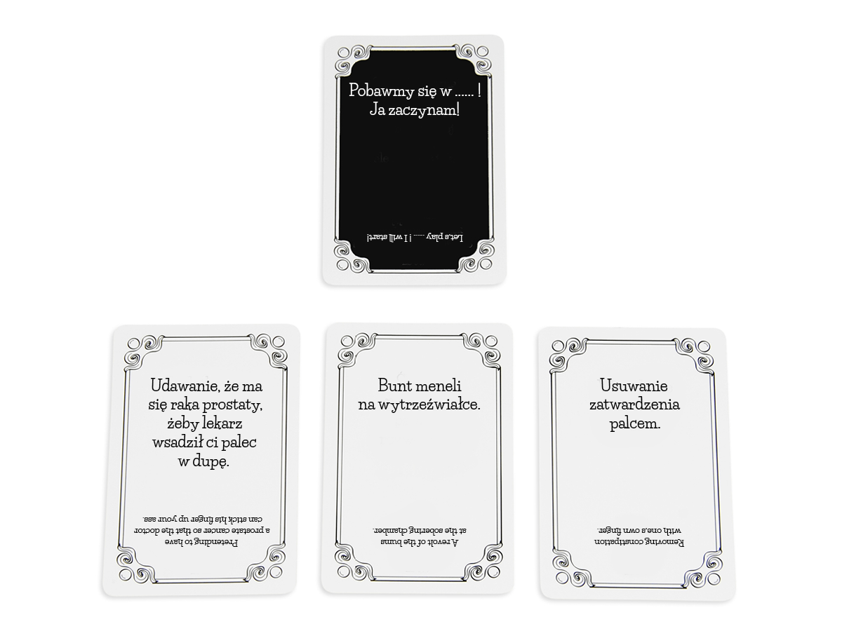 Produkt posiada przejrzyste zasady, co zachęci każdego do gry i pozwoli szybko wczuć się w atmosferę pełną czarnego humoru. Grą kieruje prosta mechanika: w każdej kolejce – Dżentelmen – zadaje pytanie z Czarnej Karty, a pozostali odpowiadają za pomocą swojej najzabawniejszej Białej Karty.