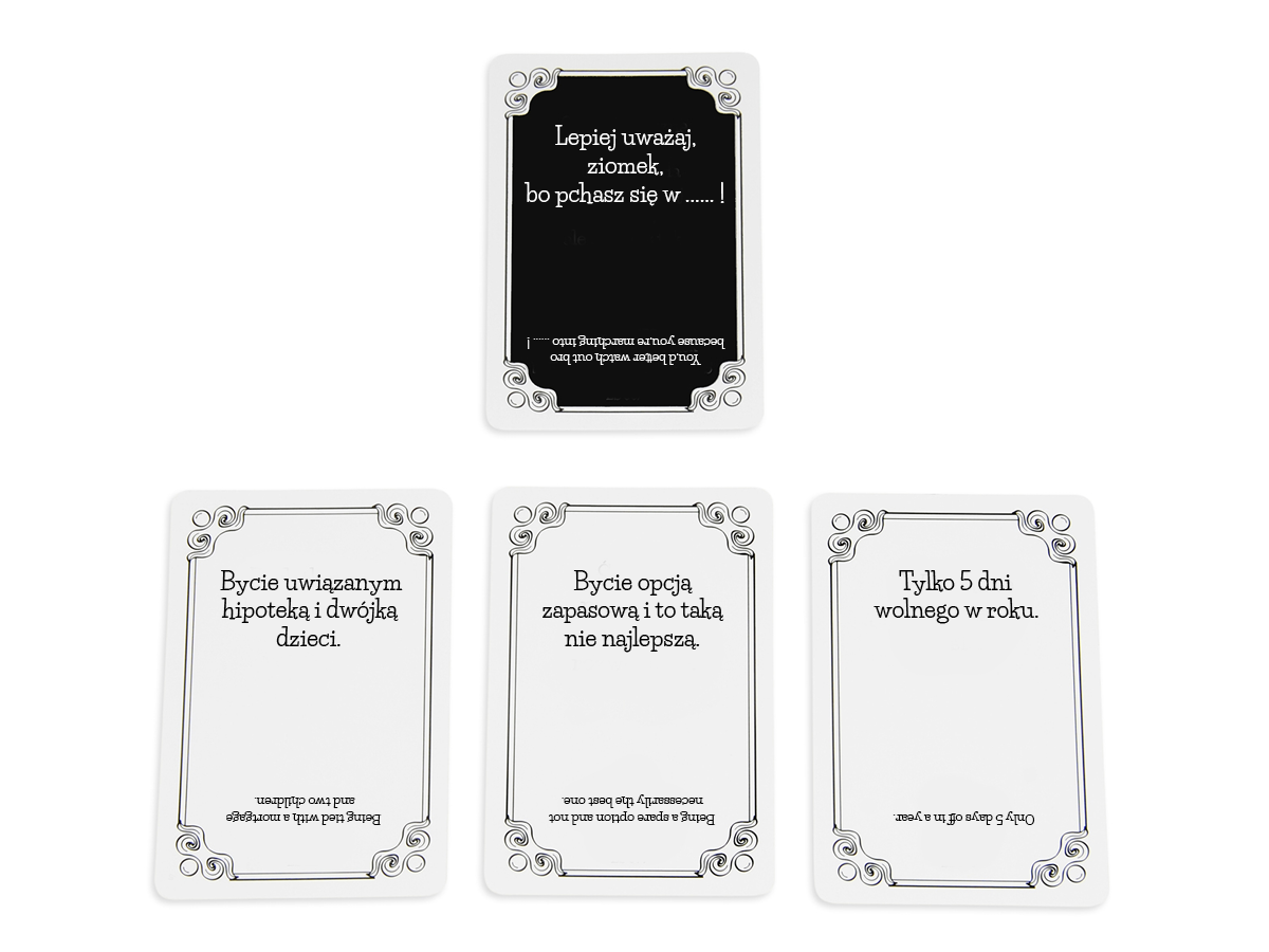 Jako jedyna na polskim rynku gra karciana zawiera anglojęzyczne odpowiedniki pytań i odpowiedzi, dzięki którym pokonuje bariery międzykulturowe i umożliwia zabawę na międzynarodowym poziomie.