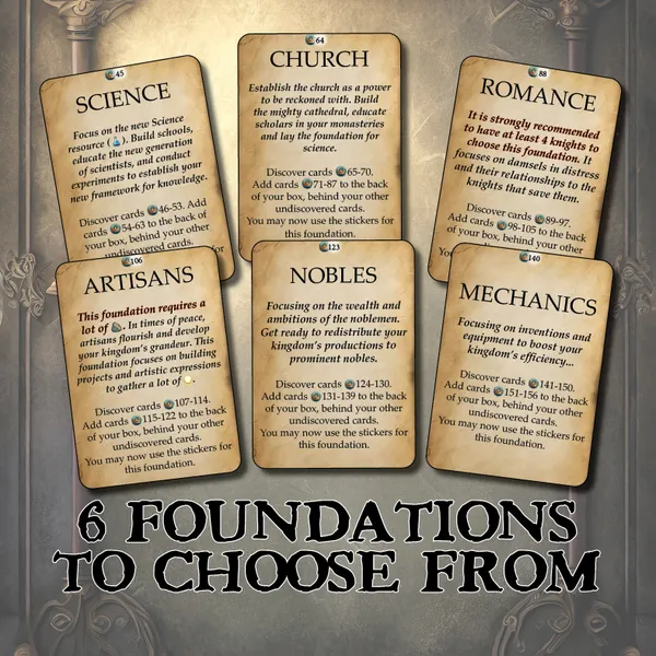 This box contains 3 expansions for Kingdom Legacy – Feudal Kingdom; The Black Plague, Invasion, and Nature’s Revenge. Each expansion lets you discover 2 out of 6 foundations to continue your progress towards fame and fortune.