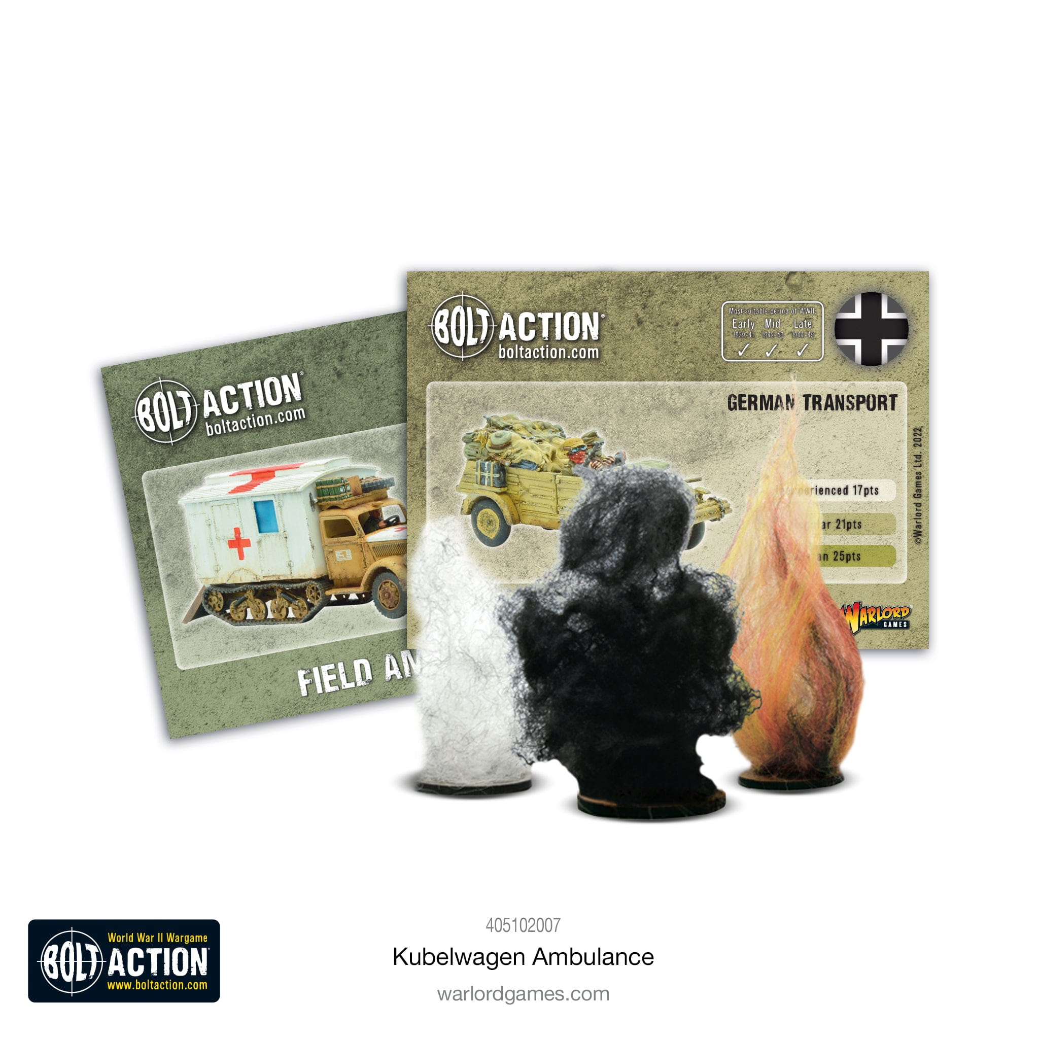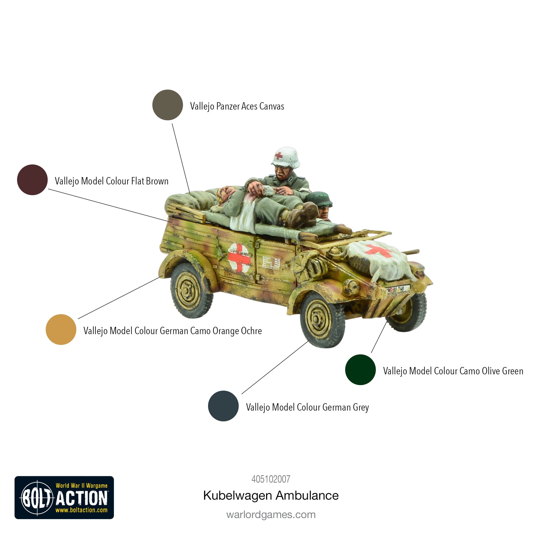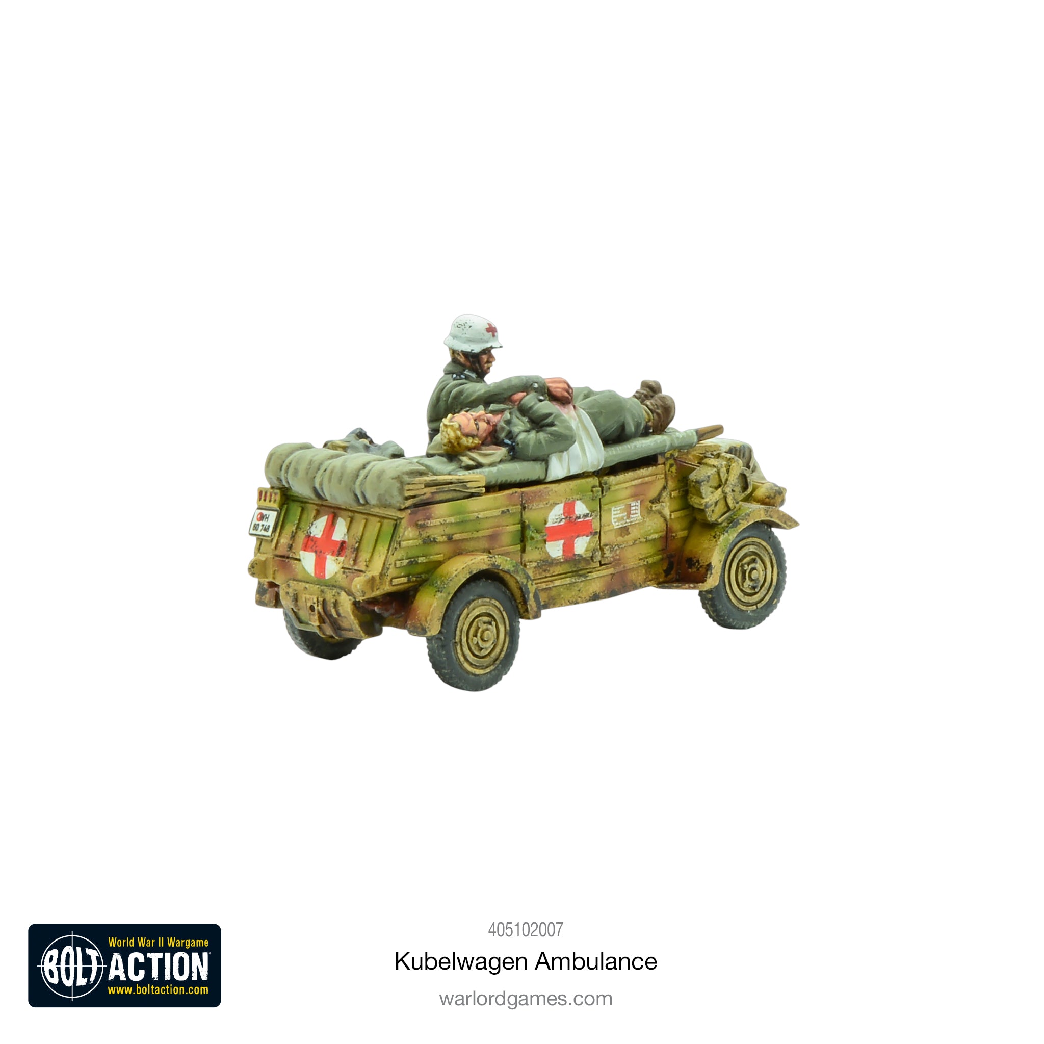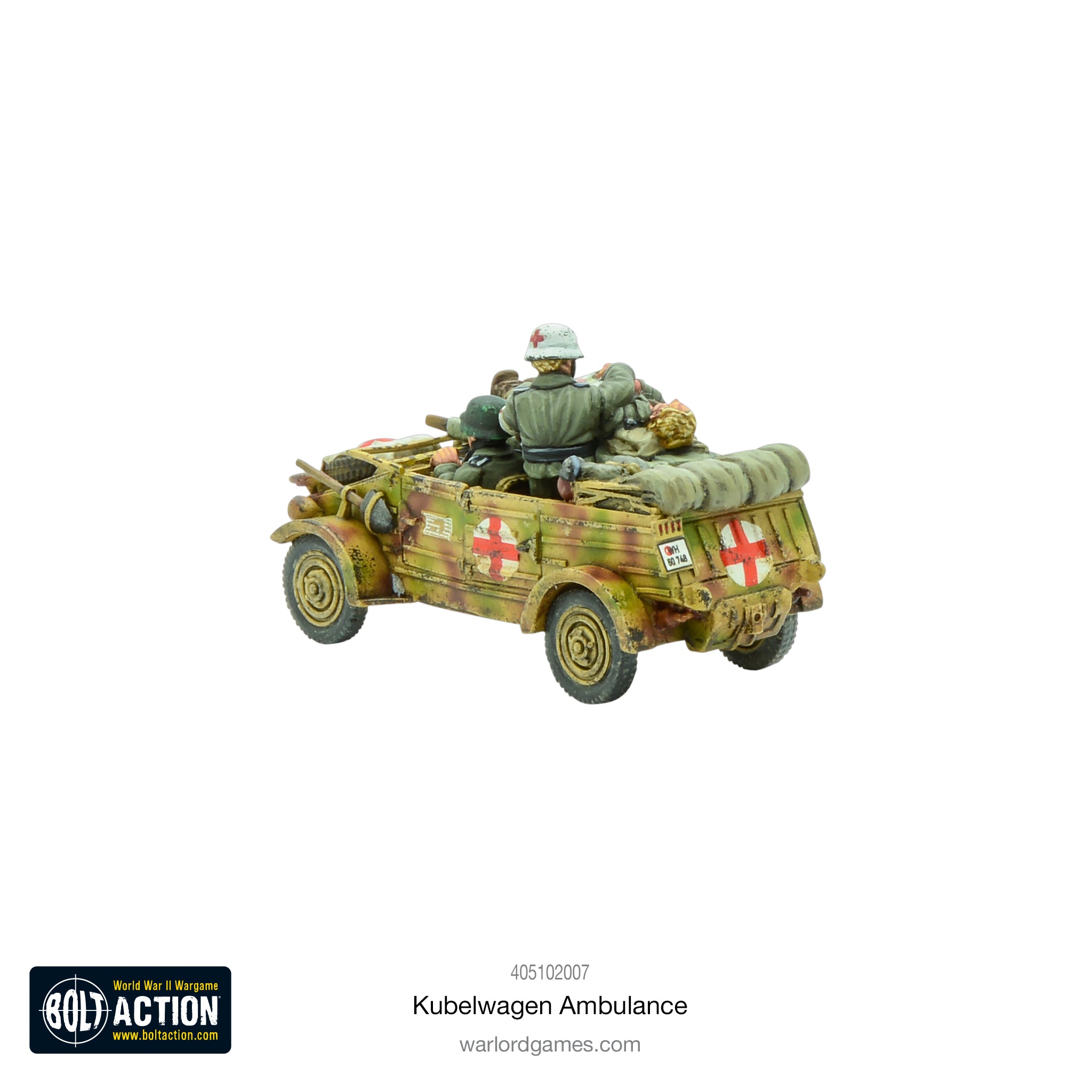 Model przedstawia niemieckiego medyka udzielającego pomocy rannemu w przerobionym samochodzie polowym Kubelwagen, zanim odjadą do najbliższego punktu pierwszej pomocy. Figurki można łatwo pomalować jako Afrika Korps, Waffen-SS lub Heer, więc pojazd ten ma szerokie zastosowanie dla wszystkich graczy armii niemieckich!