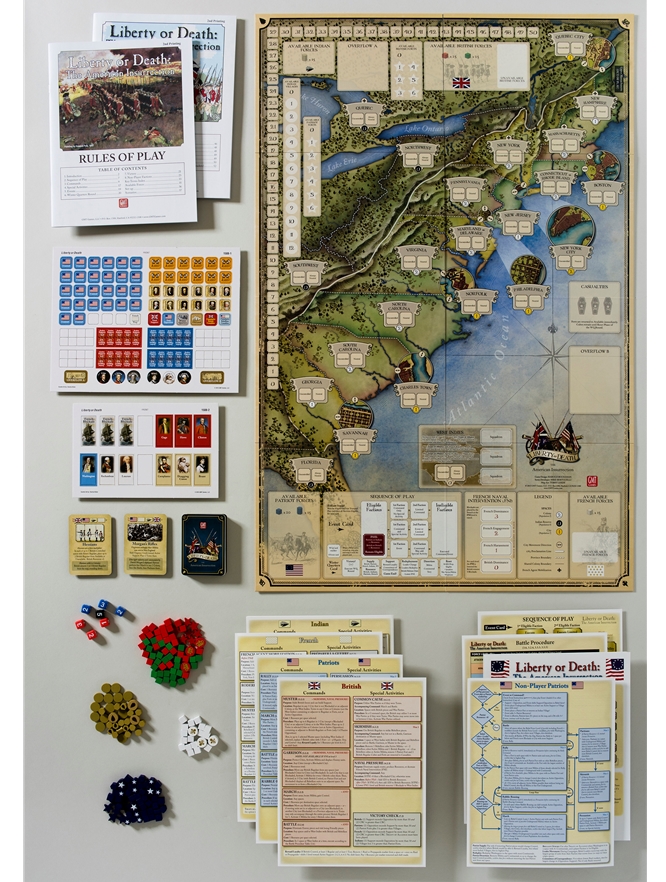 Liberty or Death: The American Insurrection features the same card-assisted counterinsurgency game system as GMT's Andean Abyss, Cuba Libre, A Distant Plain, Fire in the Lake, and Gallic War, with a set of twists that take the COIN Series to the 18th Century, including:
