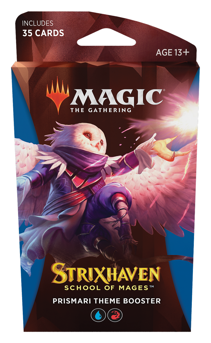 Magic The Gathering: Strixhaven - School of Mages - Theme Booster - Prismari składa się z 35 kart opartych na niebiesko-czerwonej manie, które świetnie urozmaicą każdą talię. Jest to także dobra baza pod gotową talię, wystarczy dodać 25 kart typu Land.