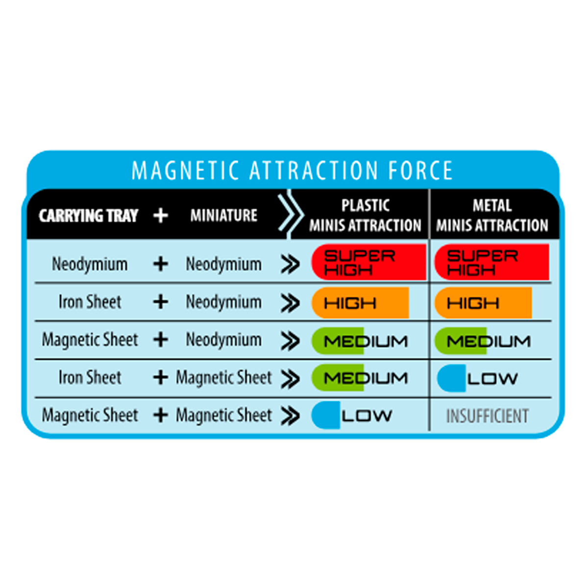 Należy pamiętać, że siła przyciągania zależy od wagi figurki (plastikowej lub metalowej) oraz rodzaju użytego magnesu lub płytki magnetycznej (patrz tabela).