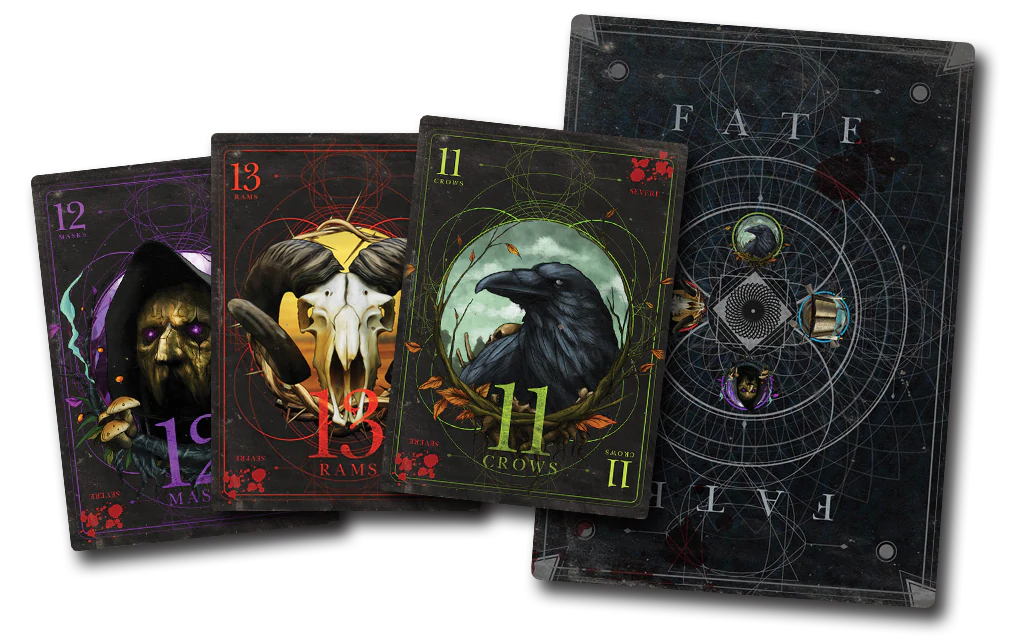 MALIFAUX uses cards, not dice, and the beautifully illustrated card pack is called a FATE DECK. Two Fate Decks are needed to play the game, one for each player.