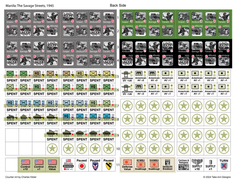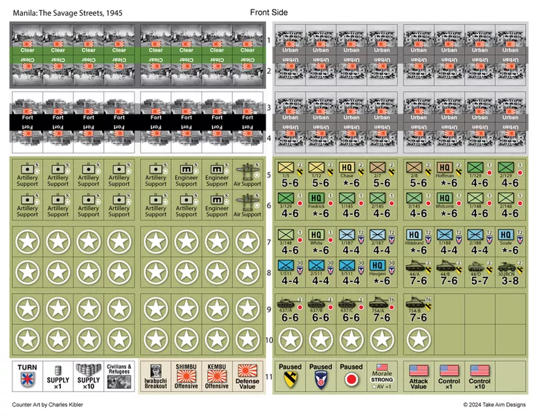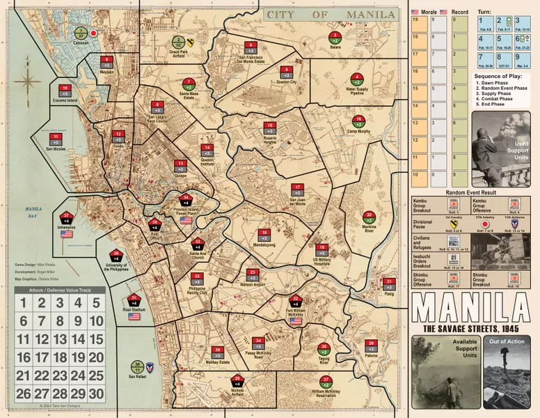 The primary game is a nine-turn campaign covering the American assault on the city during February and March 1945. The deeper American forces advance, from the city’s less developed periphery to its urban business district and fortress-like government buildings, the greater Japanese resistance becomes. The number of American units fought to exhaustion, effectively out of action, mounts. American determination to secure a rapid victory for Supreme Allied Commander General Douglas MacArthur, represented as “morale” in the game, gradually decreases. The player wins by equaling or exceeding historical American gains and loses if they fail to do so, or if morale falls too low.