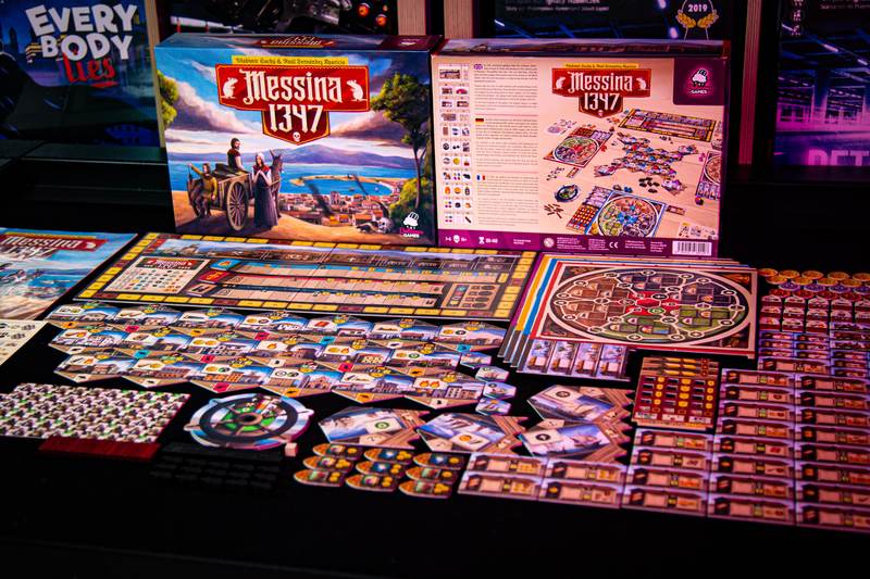 Messina 1347 to średniej ciężkości gra euro, która przeniesie was w czasy epidemii dżumy, kiedy arystokratyczne rody we włoskiej Messynie walczyły o przetrwanie, próbując jednocześnie zachować jak największe wpływy. Dzieło Vladimíra Suchý’ego (Podwodne Miasta, Praga Caput Regni) w innowacyjny sposób łączy z sobą wiele różnorodnych mechanik, takich jak zarządzanie robotnikami, tory postępu czy moderowanie planszy poprzez dokładanie kolejnych heksów. Podobnie jak w Pradze Caput Regni, tak i tutaj Suchý umiejętnie balansuje między zasadami euro gry, a zachowaniem fabularnej otoczki. Jako arystokratyczne rody będziecie starać się pomóc okolicznym mieszkańcom, osiedlając ich w pozamiejskich posiadłościach lub umieszczając w chatach kwarantannowych. Mnogość akcji do wykonania umożliwi wam postęp na trzech torach Kronik i zdobycie jak największej liczby punktów. Wygra ten z was, który położy największe zasługi dla pogrążonej w pladze czarnej śmierci Messyny. Gra, obok standardowej rozgrywki, oferuje także tryb solo oraz wariant asymetryczny.