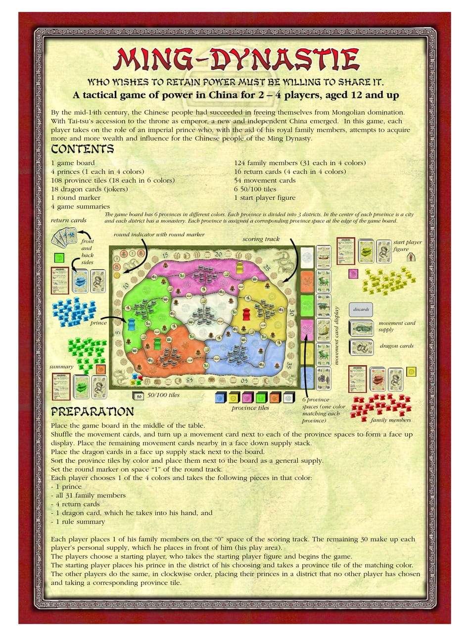 Each player takes the role of an imperial prince and tries to gain influence with his family members during the growth of the Chinese people during the Ming dynasty. Place your fellow supporters securely into the 6 Chinese provinces, which are each divided into 3 prefectures. In order where your own family members get majorities into the administration you will be recompensed during the election rounds with gifts from the emperor.