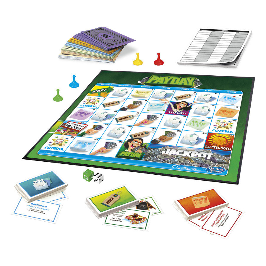 Monopoly Payday to następna odsłona kutowej gry Monopoly. Jeśli chcesz zwyciężyć, musisz zostać najbogatszym z graczy ,aby tego okonasz musisz inwestować pieniądze w nieruchomość tak aby zarabiały one na kolejne nieruchomości.Jedną z największych różnic występujących w tym wydaniu gry nie wątpliwie jest kostka Payday, która wzbogaca grę o niespodziewane zwroty akcji. Gracz, który zarobi - i zaoszczędzi - najwięcej pieniędzy, wygrywa! Proste zasady ,zwciągająca rozgrywka to elementy składowe tej wspaniałej gry rodzinnej.