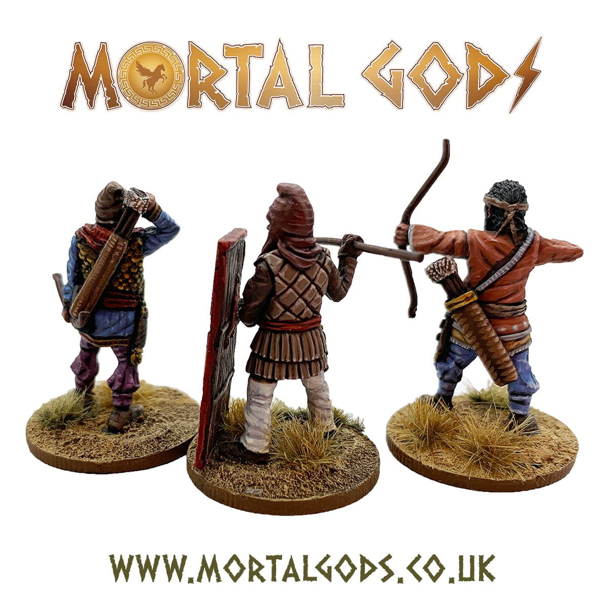 Pack contains three Mortal Gods Miniature. Made from white metal and is supplied with a round MDF group base. May require assembly.ful.