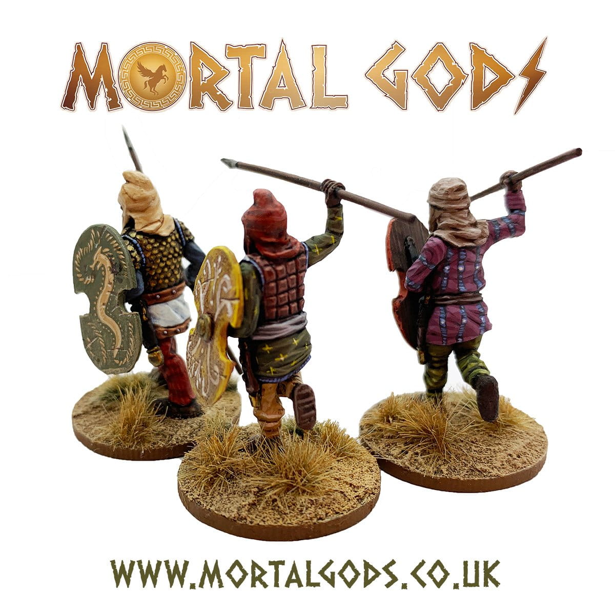 Pack contains three Mortal Gods Miniature. Made from white metal and is supplied with a round MDF group base. May require assembly.
