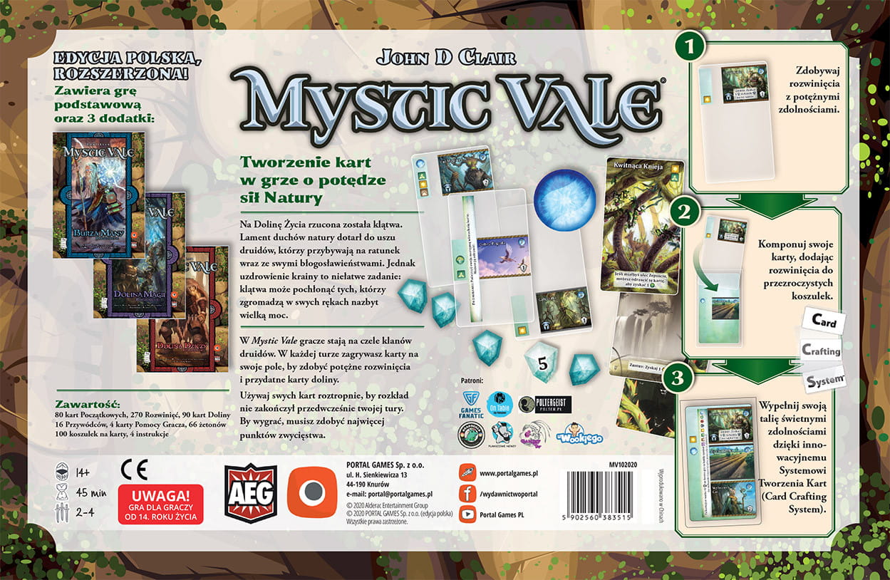 Mystic Vale to gra karciana dla 2-4 graczy, w której wcielacie się w klany druidów, które próbują przywrócić przeklętej krainie jej dawne życie. Karty w Waszych taliach przedstawiają części doliny, które musicie zrewitalizować, a każde rozwinięcie, reprezentuje nowe życie przynoszone do krainy.