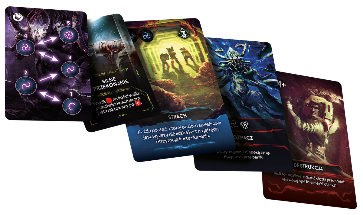 Dodatek Koszmary wprowadza do rozgrywki nową rasę intruzów i nową mechanikę szaleństwa postaci. W pudełku znajdziesz zestaw fantastycznych figurek koszmarów, żetony, a także nowe karty wydarzeń i karty paniki.