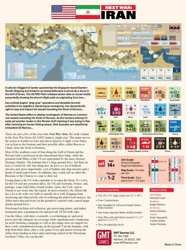 Next War: Iran is the sixth game in the Next War series. It is unique in the series in that the Allied player has to do the attacking while the non-Allied player attempts to defend its territory against neo-imperial oppression. With a long logistical tail, few true allies in the region, and the menace of Iran's A2AD capabilities, re-opening the Straits is a tall order.