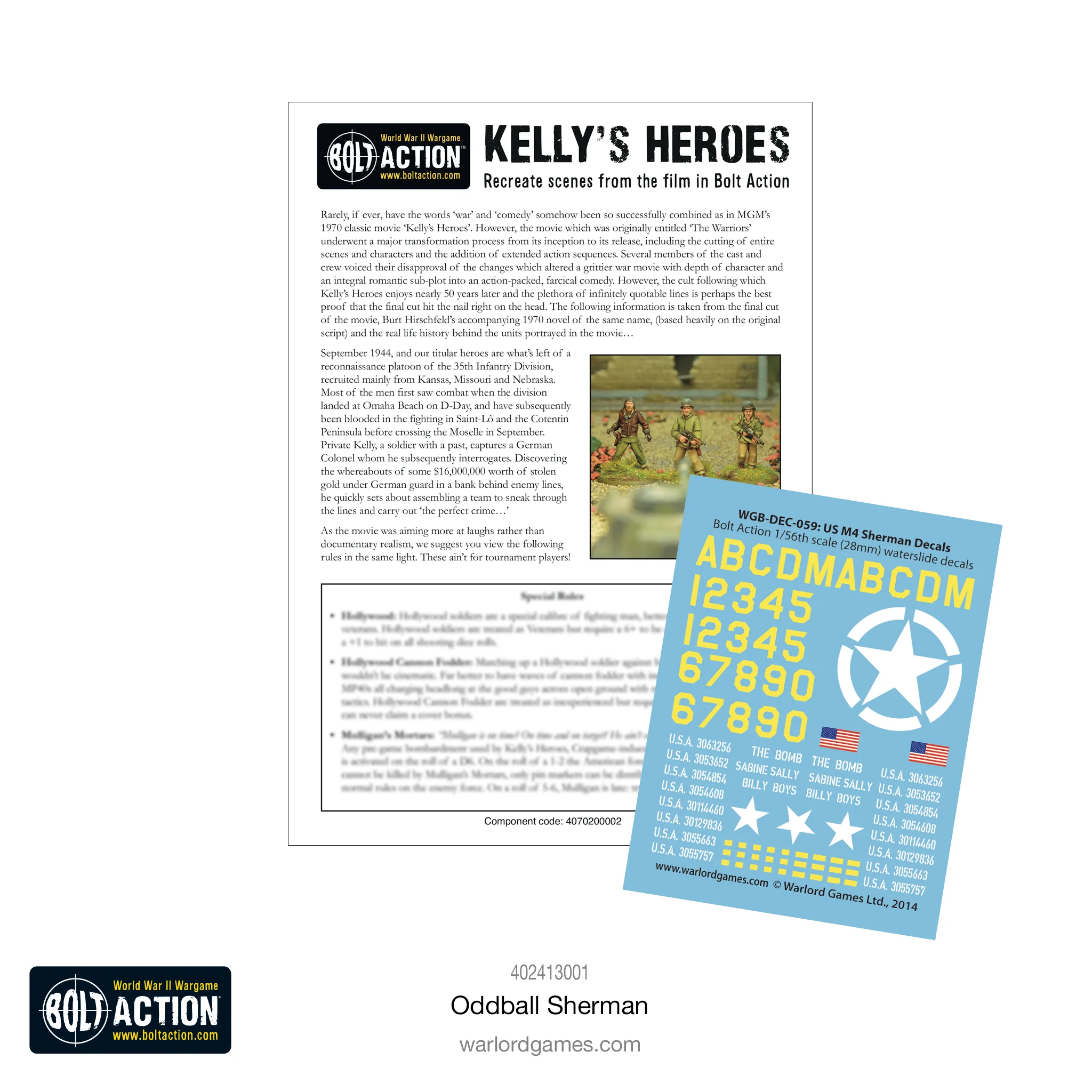 W każdym pudełku Oddballa Shermana znajduje się wspaniały bonus! Kolorowa, 8-stronicowa broszura zawiera dla każdego bohatera i pojazdu spersonalizowane, tematyczne zasady specjalne, które dodadzą hollywoodzkiego charakteru i odwagi Twoim filmowym rozgrywkom w Bolt Action.