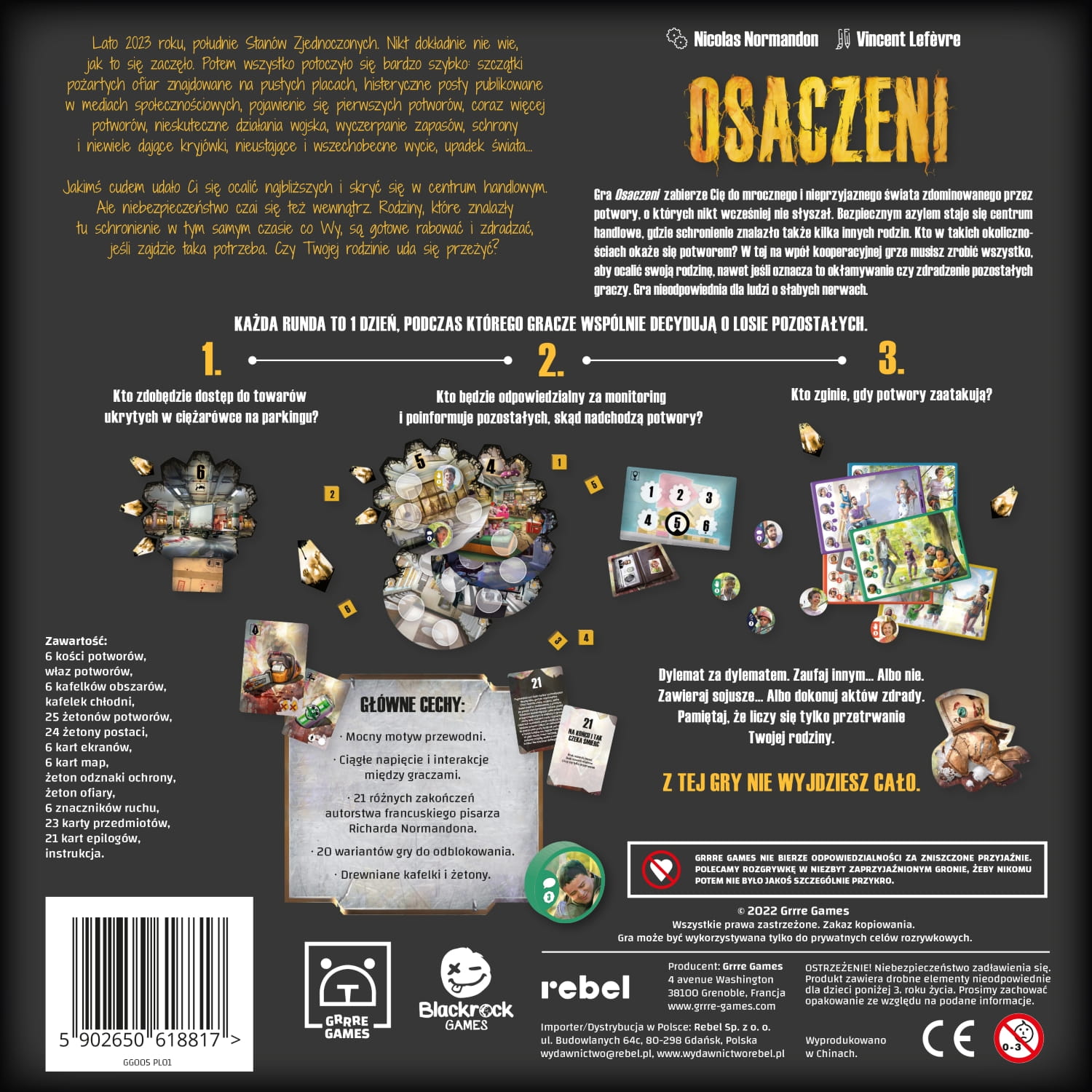 Osaczeni to semi-kooperacyjna gra przygodowa, która zaprasza uczestników do mrocznego świata zdominowanego przez potwory, o jakich nikt dotąd nie słyszał. Podczas rozgrywki wcielisz się w jednego z ocalałych, którzy próbują schronić się w centrum handlowym. Oprócz Twojej rodziny jest tam też kilka innych, a każda zrobi wszystko, by przetrwać. Czas odrzucić wszelkie sentymenty – kłamstwo, zdrada i rabunek mogą okazać się jedyną szansą, by Twoi najbliżsi mogli wyjść żywi z tego koszmaru.