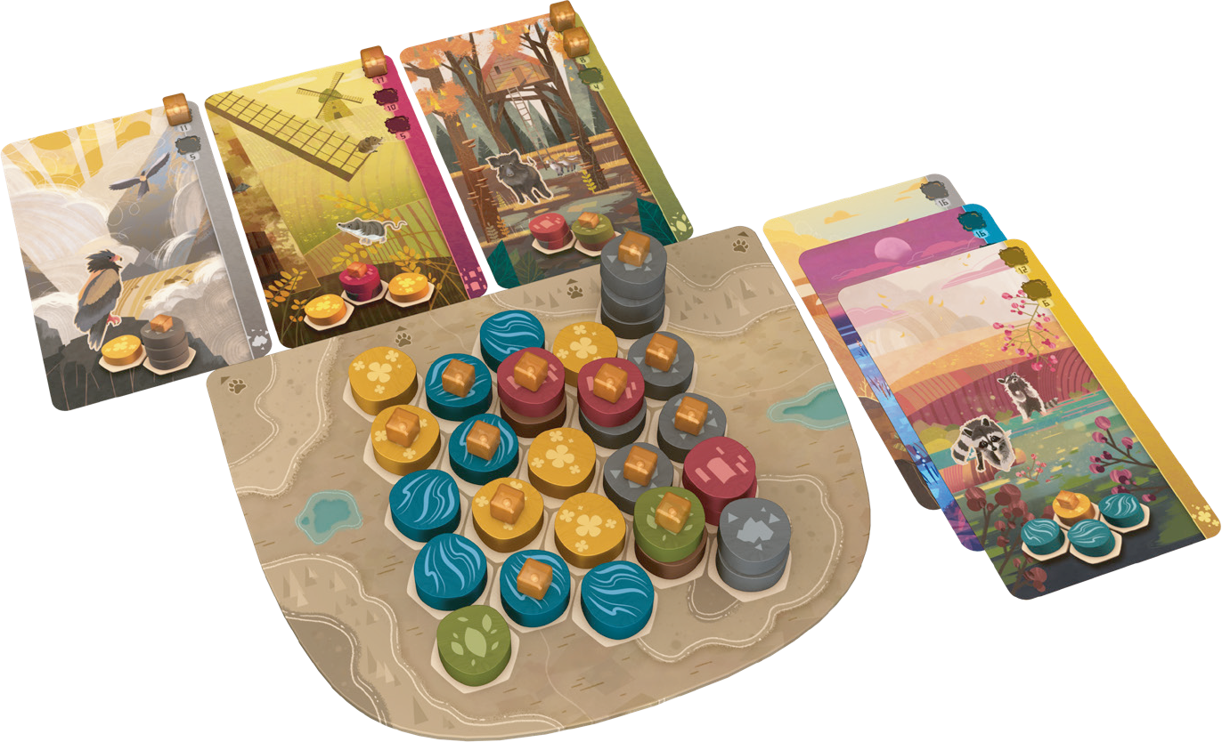 - Gdy uda nam się odwzorować wskazany układ żetonów, możemy przenieść jeden ze znaczników zwierząt z karty na odpowiedni element krajobrazu na naszej planszetce.