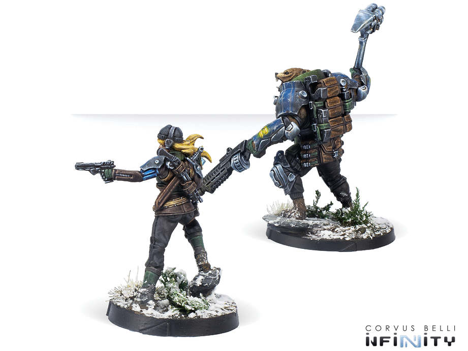 This box includes two miniatures: a thermoplastic-injected miniature of a Polaris Bearpode and a metal miniature of Masha, Polaris Controller.