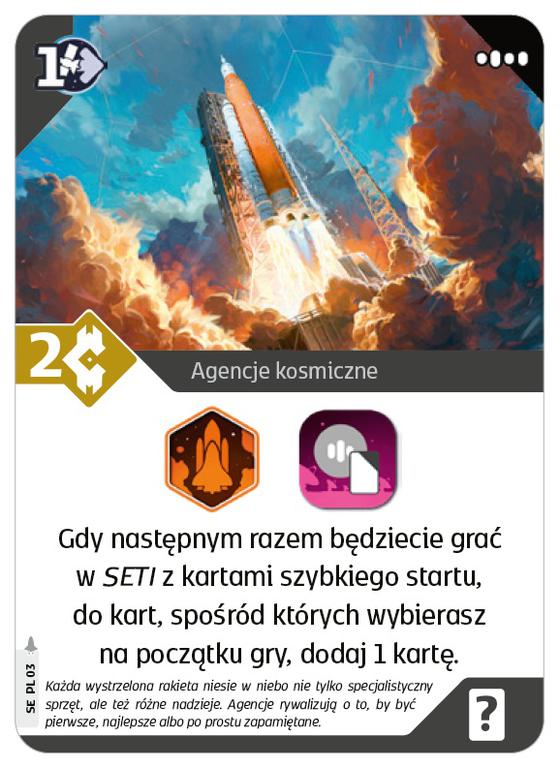 SETI: Poszukiwania pozaziemskich cywilizacji - Agencje kosmiczne to rozszerzenie wprowadzające asymetryczne warunki początkowe – od tej pory każdy z graczy będzie reprezentował inną firmę z własnym zestawem narzędzi i umiejętności, co pozwoli na wypróbowanie zupełnie nowych strategii. Oprócz tego w pudełku znajdziemy 3 nowe gatunki obcych z unikalnym zestawem zasad oraz ponad 40 nowych kart inspirowanych rzeczywistymi projektami naukowymi.