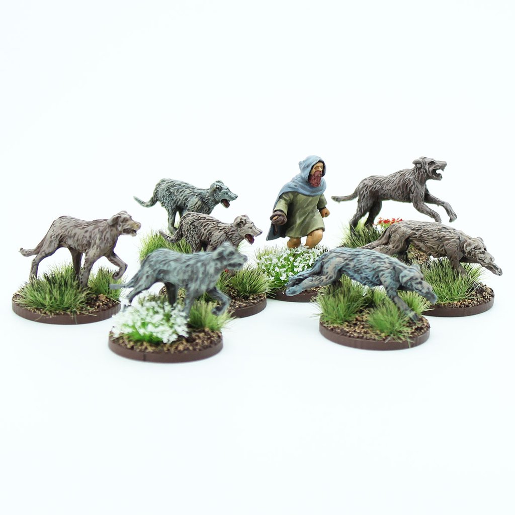 Szkocki treser i psy bojowe - opakowanie zawiera 8 metalowych figurek. Modele są dostarczane niepomalowane i mogą wymagać sklejenia. Banery, dzidy i podstawki nie są dołączane.