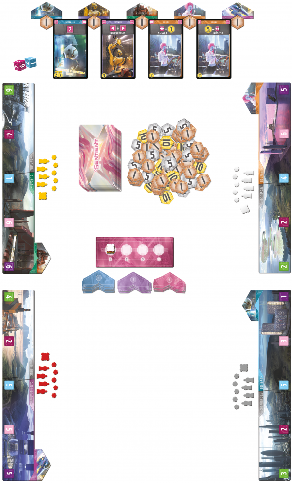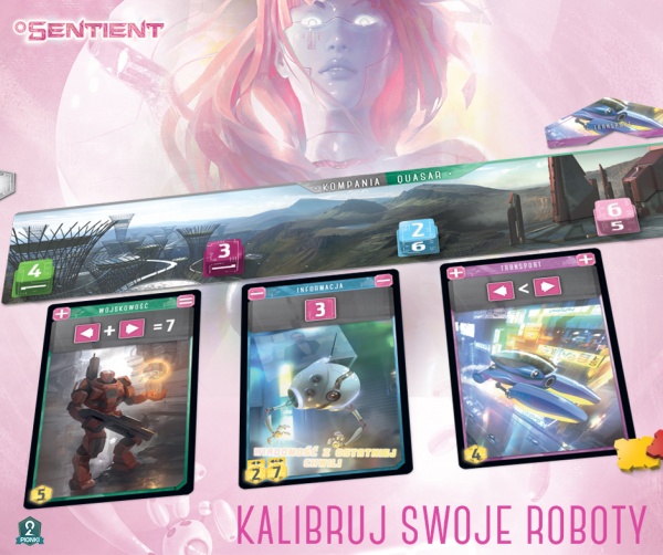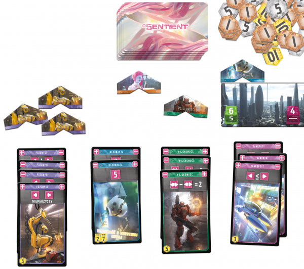 Sentient to gra dla 2 do 4 osób, w której będziesz manipulować swoimi kartami reprezentującymi roboty i tworzyć z ich pomocą układ oraz kalibrować swoimi kośćmi tak, aby uzyskać jak największą przewagę nad przeciwnikami.