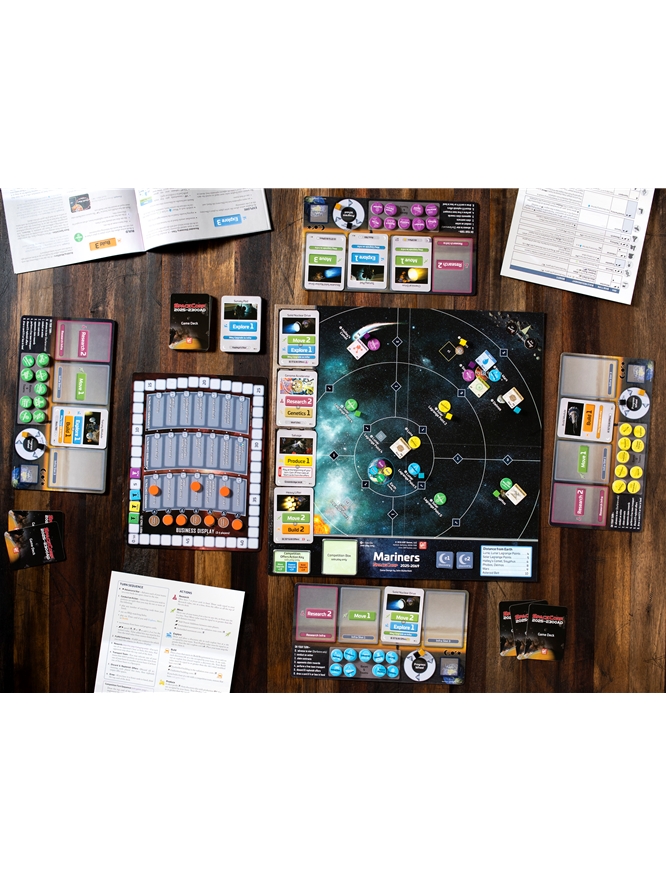 During the game you earn profit from exploration discoveries, by conducting production at resource sites, and by completing contracts. For example, a contract in the Mariners era rewards the first player to build a base on Mars. The player with the most profit at the end of the game wins but there are many ways to get there. Will you focus on...