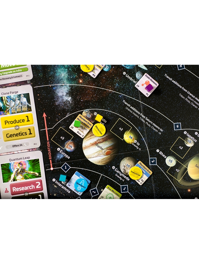 For example, playing Move cards with a total value of 5 allows you to move a team from Earth to a Solar Lagrange Point. Other card plays allow a team on an asteroid or moon to explore there, or to build a base such as a spaceport, a refinery or a bio lab. You can also play cards to conduct research (draw new cards), production (gain profit from a site with resources), genetics (advance toward gaining genetic advantages for your teams), revelations (advance toward gaining technological breakthroughs), as well as special actions such as deep space probes and prototypes.