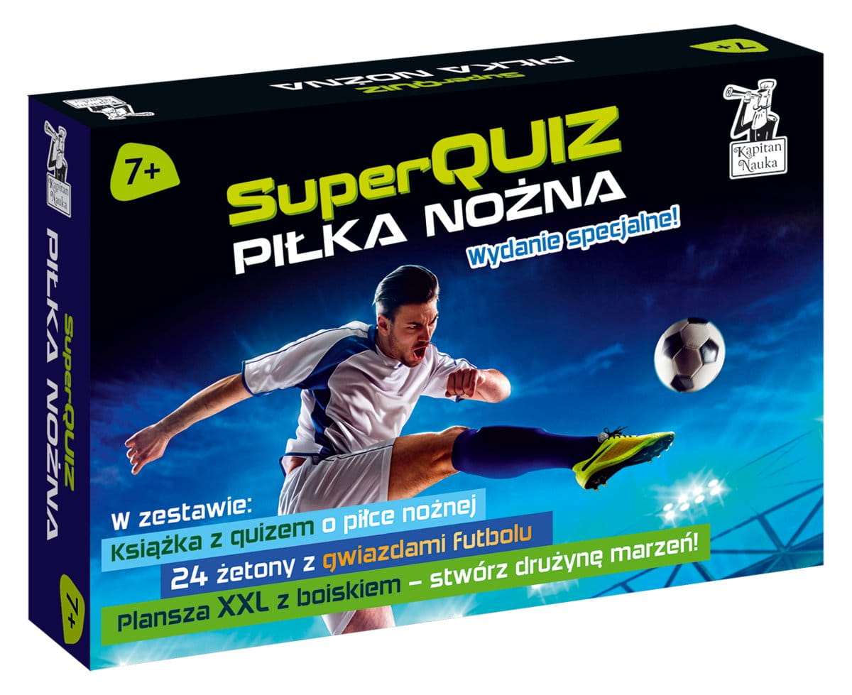 Bestsellerowy SuperQuiz Piłka nożna z ciekawostkami i zagadkami oraz dodatkiem w postaci plakatu przedstawiającego boisko piłkarskie oraz 24 żetonów z nazwiskami polskich i zagranicznych gwiazd futbolu, z których można stworzyć własną drużynę marzeń lub przećwiczyć różne ustawienia taktyczne.