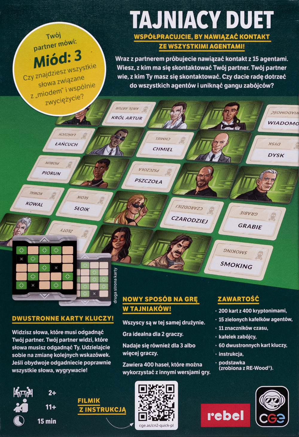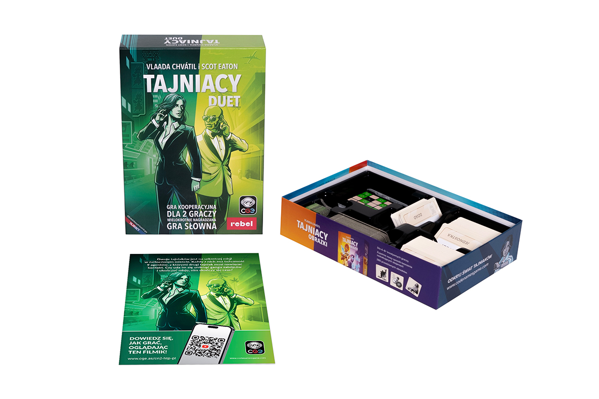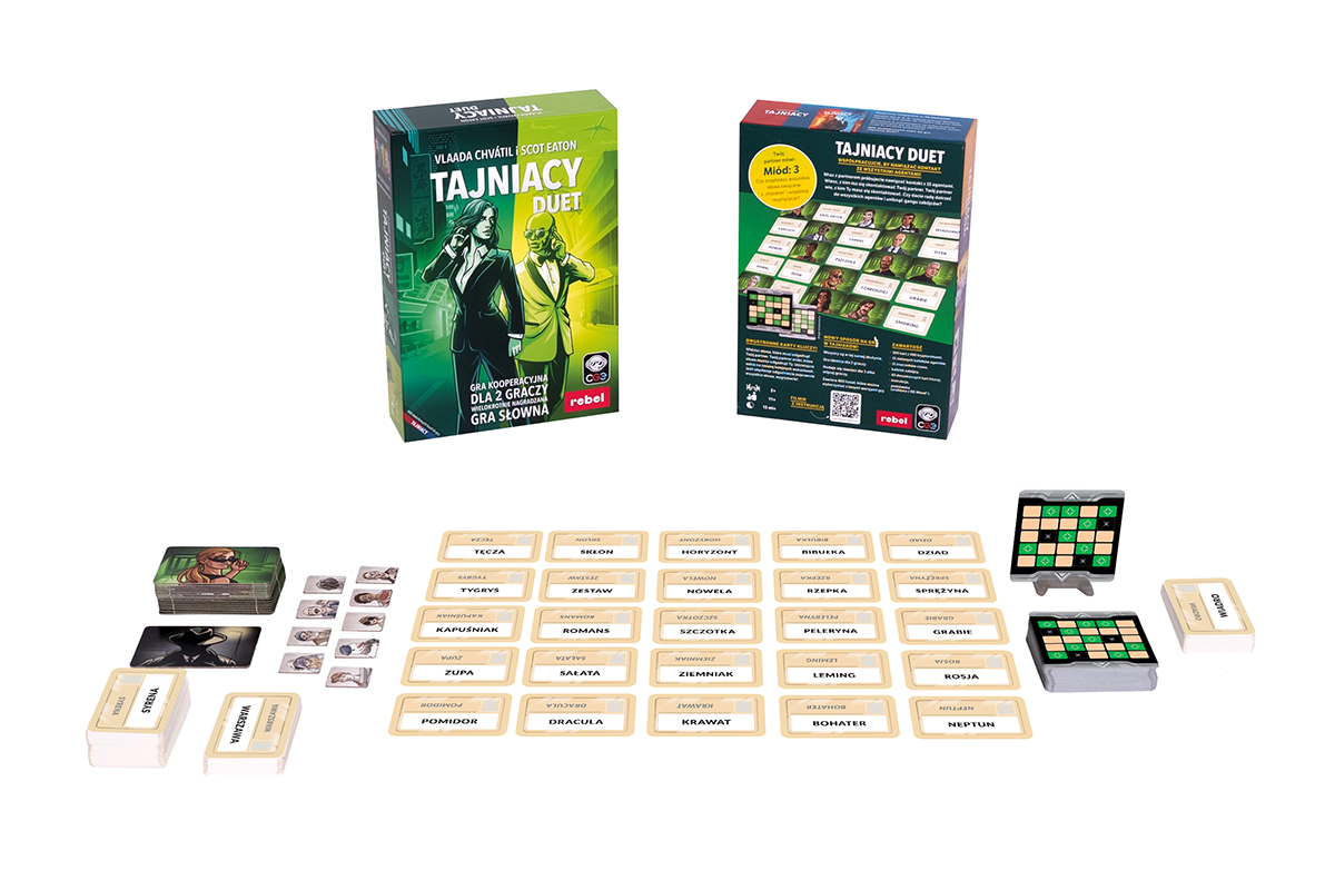 Tajniacy: Duet to kooperacyjna gra słowna dla 2 lub więcej graczy. Na karcie klucza znajduje się 12 pól – 9 pól oznacza słowa, które musi odgadnąć drugi tajniak, a 3 to słowa, których musi się wystrzegać. Aby naprowadzić swojego partnera na konkretne słowa (bądź słowo), dajesz mu jednowyrazowe wskazówki. Z kolei Twój partner daje Ci wskazówki do słów, które musisz odgadnąć. Jeśli obydwoje odgadniecie wszystkie słowa, nim wykorzystacie wszystkie swoje tury, wygrywacie i możecie razem świętować zwycięstwo! Hasła są wieloznaczne, skojarzenia również – owocuje to rozgrywką pełną śmiechu i emocji.