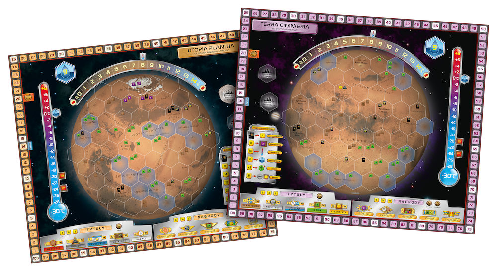 Rozegraj przygodę na lawowych równinach Północy albo wyżynnych regionach Południa! Terraformacja Marsa: Utopia i Cimmeria oferuje dwa zupełnie nowe spojrzenia na Czerwoną Planetę w postaci specjalnych, alternatywnych map: Utopia Planitia i Terra Cimmeria. Każda z nich przedstawia nowy obszar Marsa z kolejnymi premiami, innym rozmieszczeniem oceanów, nowymi tytułami i nagrodami. Dzięki temu gracze muszą odrzucić utarte schematy działania na początku rozgrywki i mogą wypróbować zupełnie nowe strategie!