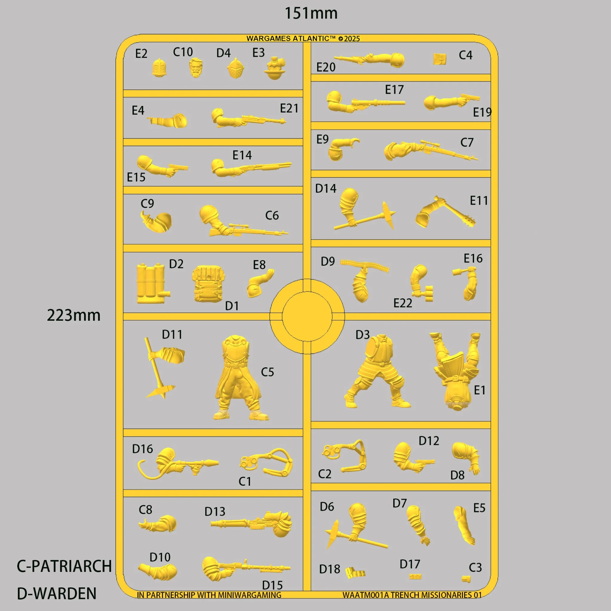 Misjonarze z Okopów to oddział wojenny oparty na wierze, kompatybilny ze światem Krucjaty Okopów. Zaprojektowane jako replika Nowej Antiochii, te inspirowane mormonami figurki wnoszą wyjątkowy charakter i głębię narracji do bitew planszowych. Każdy model oddaje mroczną determinację wojowników, którzy maszerują na ziemię niczyją, uzbrojeni w relikwie, karabiny i posłuszeństwo z precyzją. Idealni dla kolekcjonerów, malarzy i graczy, Misjonarze z Okopów dodają każdej armii wyrazistej i tematycznej siły.