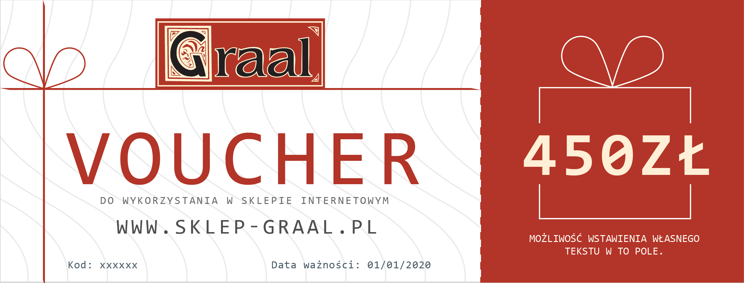 Voucher istnieje tylko w postaci kodu w wersji elektronicznej - wysyłamy go mailem i można go zrealizować tylko w sklepie internetowym WWW. SKLEP-GRAAL.PL. Jednak po dokonaniu zakupu istnieje możliwość wydrukowania Vouchera, w razie zaistniałej potrzeby.