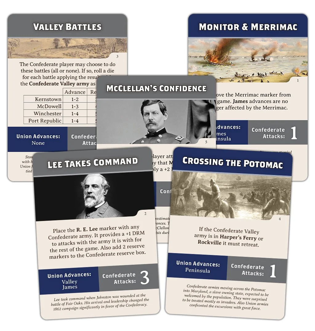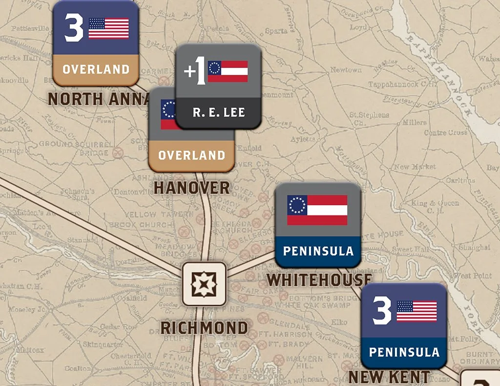 PLANSZA DO GRY: Na mapie znajdują się cztery tory z trasami awansu do Richmond, wzdłuż których znajdują się lokacje. Dwa z torów łączą Waszyngton i Richmond. Lokacje to okręgi, a ufortyfikowane lokacje to pięciokąty. Armie Konfederatów i Unii próbują wkroczyć do wrogich lokacji i zająć je, atakując ich znaczniki armii broniące lokacji.