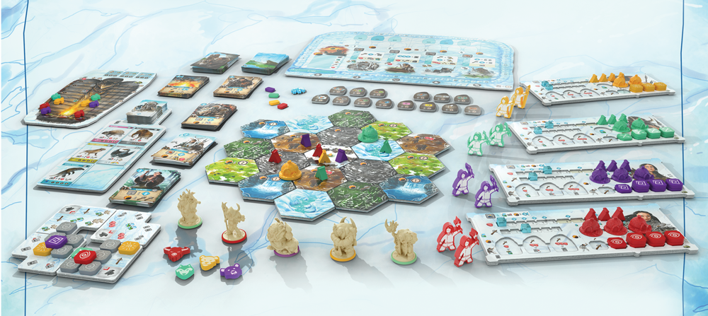 1 główna plansza ● 1 plansza zwierząt ● 1 plansza totemu ● 4 plansze graczy ● 4 kafelki megalitów ● 25 kafelków terenu ● 20 kafelków świętych kamieni ● 1 znacznik rund ● 60 kart zwierząt ● 41 kart kultury ● 75 kart plemienia ● 36 kart początkowych ● 5 kart wodzów ● 4 karty pochówku ● 5 kart przygotowania ● 4 karty pomocy ● 8 figurek plemienia ● 5 figurek wodzów ● 4 podstawki pod figurki wodzów ● 12 znaczników wiosek ● 20 znaczników obozowisk ● 40 znaczników megalitów ● 4 znaczniki plemienia ● 8 znaczników totemu ● 4 znaczniki punktacji ● 8 znaczników surowców ● 10 żetonów lodowca ● 5 żetonów odpoczynku ● Elementy dla trybu solo: 16 kart Nomady ● 6 kart mapy ● 2 karty pomocy ● 1 żeton Nomady