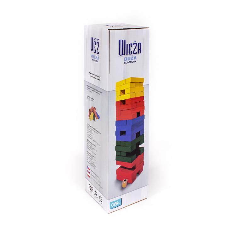 Gra zawiera: 60 kolorowych drewnianych klocków, kości i zasady.